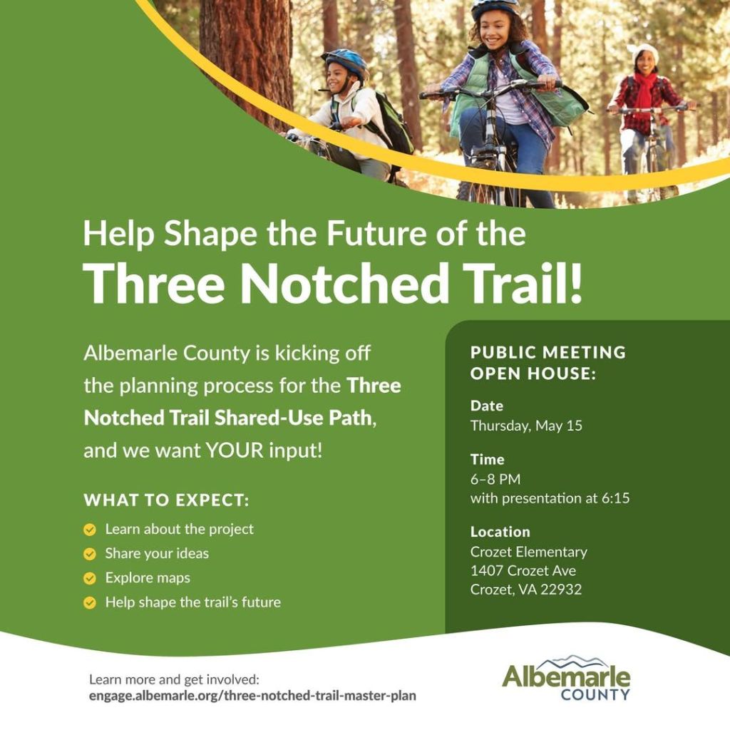 Albemarle County is hosting a Three Notched Trail public meeting on Thursday May 15, 2025, from 6:00 – 8:00 pm at Crozet Elementary School.