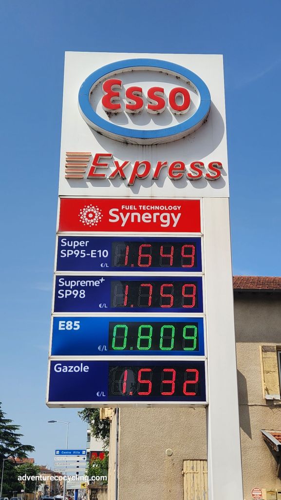 Note: For comparison purposes, this analysis uses national averages, which are a bit higher than the price shown in the photo from Villefranche-sur-Saône. Also, petrol prices and exchange rates vary on a daily basis.