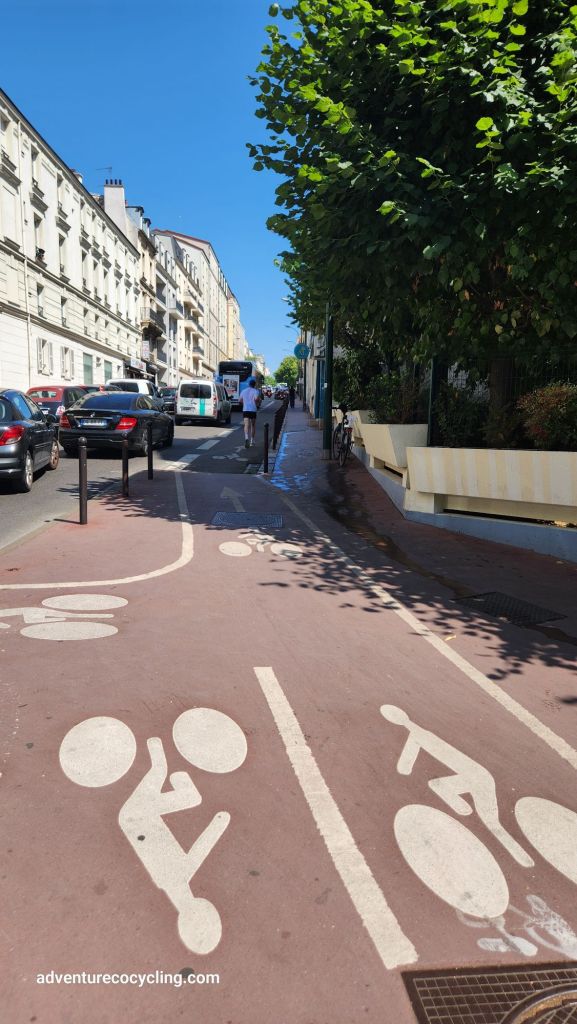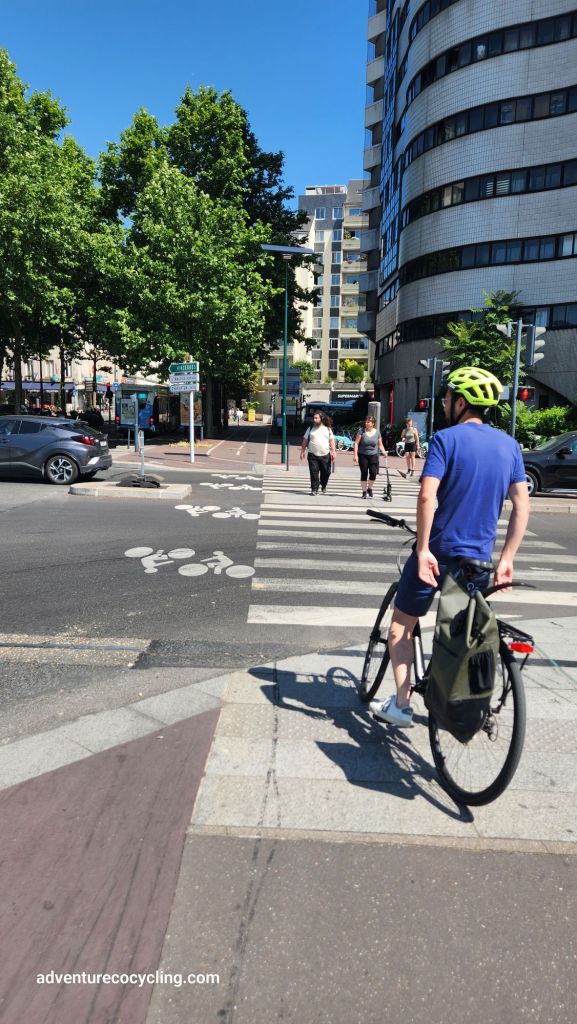 Departing from the commune of Alfortville, a southeastern suburb of Paris where we are staying with longtime friends, I first ventured to Bois de Vincennes, a green space on 995 hectares (2,460 acres) with biking/hiking trails, lakes, a botanical garden and zoo. The ride to Bois de Vincennes took me through the communes of Alfortville, Maisons-Alfort, and across the Marne River into Saint-Maurice. The route comprised a range of active transportation infrastructure to include bike lanes and cycle tracks, shared use paths, crosswalks with pedestrian and bicycle signals, signage, and pavement markings.