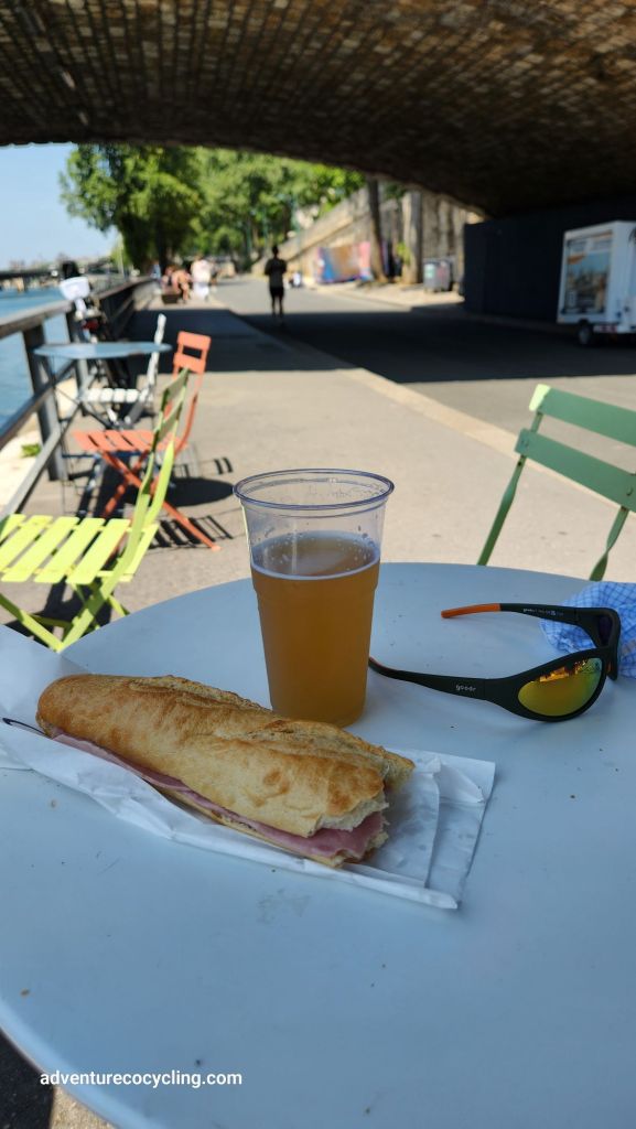 Continuing along on the Marne River, through the commune of Charenton-le-Pont, to its confluence with the Seine River, I arrived in Paris, stopping briefly at Chez Daniel, a small riverside cafe, to refuel with a beer and simple ham and cheese sandwich while enjoying views of the Seine and Paris skyline.