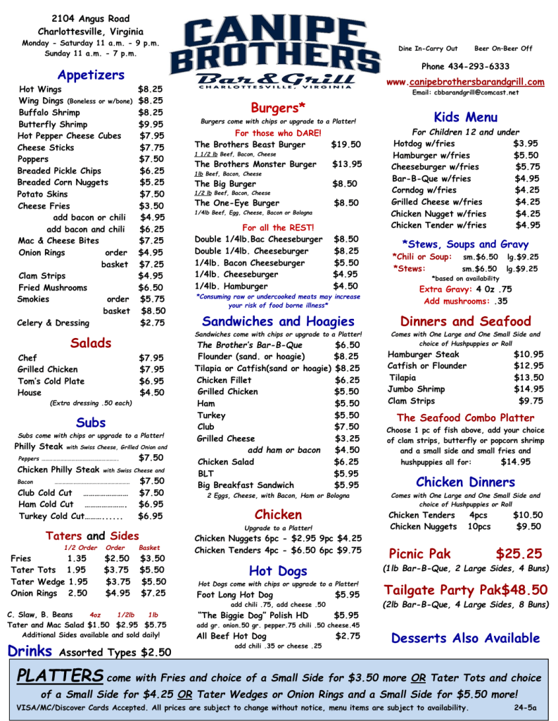 Upon ordering, I chatted up the lady to get a bit of history on the establishment. She was gracious in addressing my inquiries (while likely thinking to herself, this dude sure asks a lot of questions). She noted that Canipe Brothers has been in the location for nearly 20 years. Prior to that, it was the long-time location of Big Jim’s, which was apparently a well-known local watering hole. She described Canipe Brothers as a local, blue-collar establishment, drawing a good lunch crowd. She also noted that despite its relatively close proximity (less than 2 miles) to the UVA campus (excuse me, grounds), students are not regular clientele, but are not too uncommon. During my brief visit several young folks in UVA gear were having lunch and drinks.