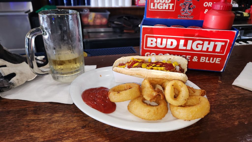 During the nearly 10 years I have called Charlottesville home, I can honestly say I had never heard of Canipe Brothers Bar & Grill. I discovered it completely by accident recently and stopped in for a visit. Canipe Brothers is located in a small side street strip mall shared with a convenience store and barber shop. I stopped in on a gorgeous Saturday afternoon in early August. The place is not large. It has maybe 6 seats at the bar, a couple of tables, and a few booths. While it was not crowded, there was a pretty steady stream of to-go orders, which I interpreted as a good sign. Being a party of one, I sat at the bar, which offered a view of the TV (showing college football, of course), the beer selection, happy hour specials, and miscellaneous bar decor. I was greeted by the lady behind the bar and, after perusing the menu, I ordered a hot dog, half an order of onion rings, and a domestic draft beer.