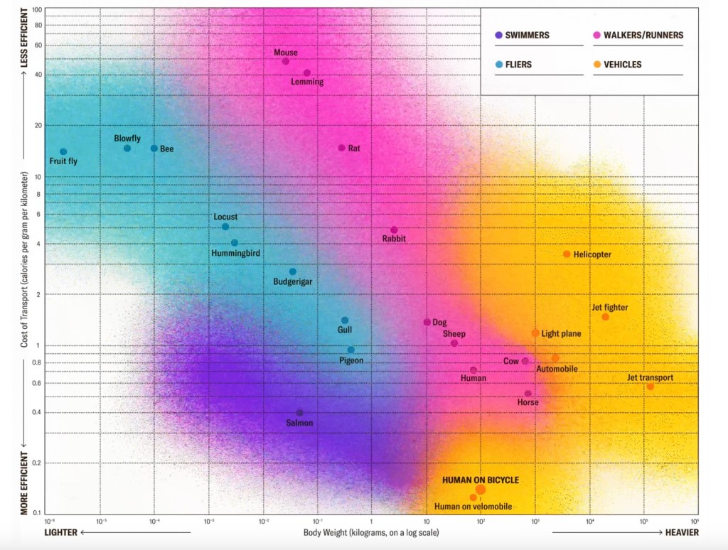 Per the article, “More than half a century after Scientific American first declared the bicycle “the most efficient form of human transport,” the magazine has confirmed that the humble two-wheeled dream machine still reigns supreme. Scientific American has revisited its iconic 1973 graph—and the results hold: the bicycle remains the planet’s most energy-efficient mode of transport.“