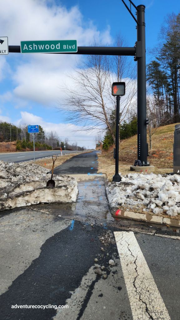While Mother Nature is finally assisting with snow melt on local active transportation facilities, common snow clearing practices on local roadways can present challenges. It is common, in large part due to proximity to the roadway, if not specific policy, for active transportation facilities to be used as de facto snow storage during snow clearing operations. This is issue is particularly pronounced at intersections where snow is often piled on curb ramps or other facilities. These large piles of snow and ice are obstacles to safe passage for weeks after the snow event.
